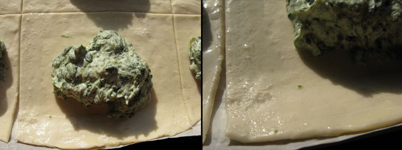 con l’aiuto di un cucchiaio crea delle palline di impasto e adagiale sui quadrati di pasta sfoglia, i più esperti possono tentare di realizzare l’impasto con la classica forma delle chenelle o quenelle: