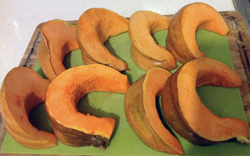 Pulendo la zucca il peso si riduce, per darti un’idea ho acquistato circa 1,3Kg di zucca con la buccia arancio che risulta più semplice da tagliare a cubetti e pulire rispetto alla zucca con buccia verde 🙂