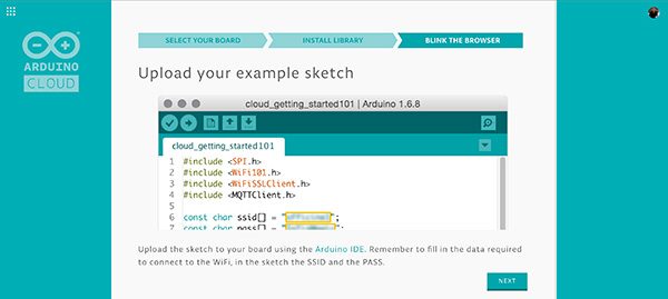 prima di cliccare su “next” devi caricare lo sketch sulla MKR1000 o altro Arduino/Genuino dotato di WiFi101 se hai selezionato questa come configurazione per il tuo progetto arduino.cc cloud e quindi cliccare NEXT.