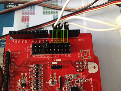 Ciascun servo deve essere alimentato da 4.8v a 6v per cui puoi utilizzare i 5v di arduino e presenta un pin di controllo che devi collegare ad una uscita pwm libera della Bluetooth Low Energy Shield servo, io ho usato i pin 3,5 e 6 come per il precedente articolo:
