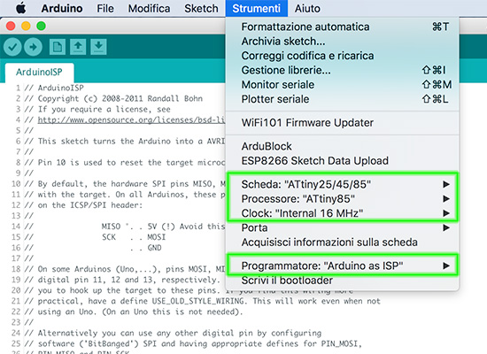 Da ora sei pronto per trasferire tutti i tuoi sketch sui micro controllori della famiglia Attiny.