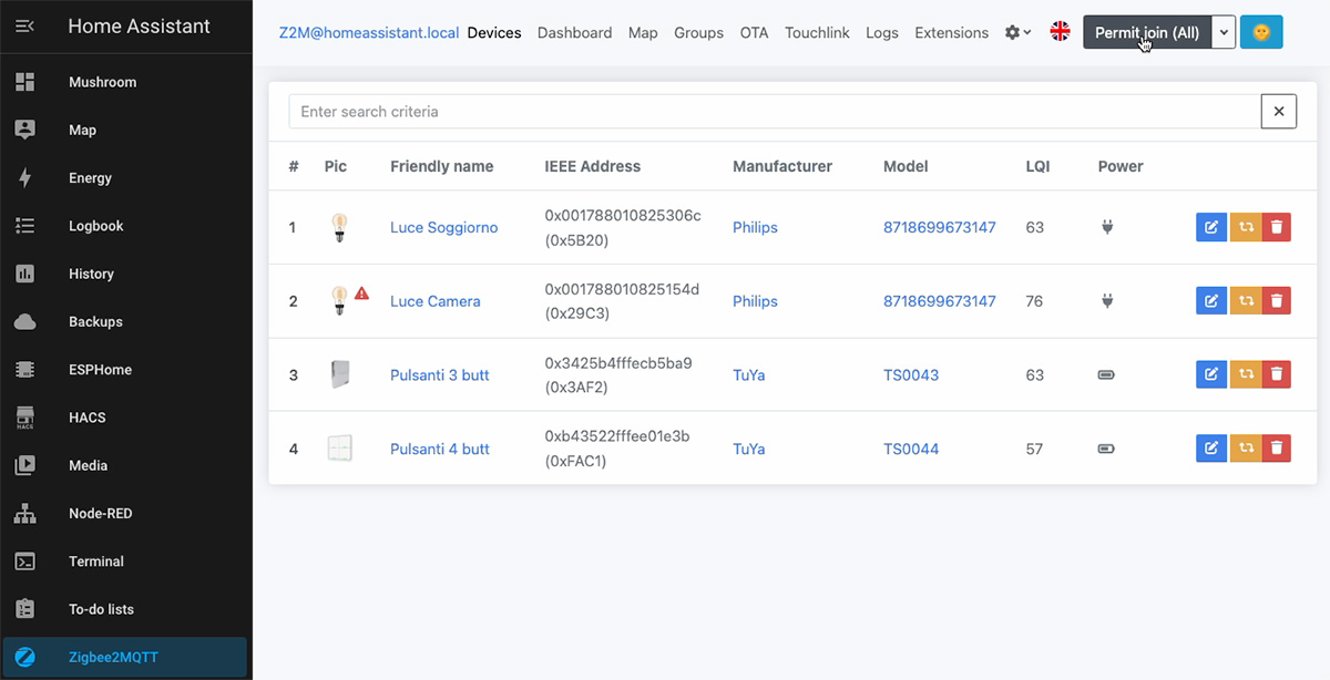 a questo punto puoi aprire l’interfaccia ZigBee su Home Assistant e dovresti vedere l’elenco dei dispositivi ZigBee che hai già associato, premi su “permit join (All):