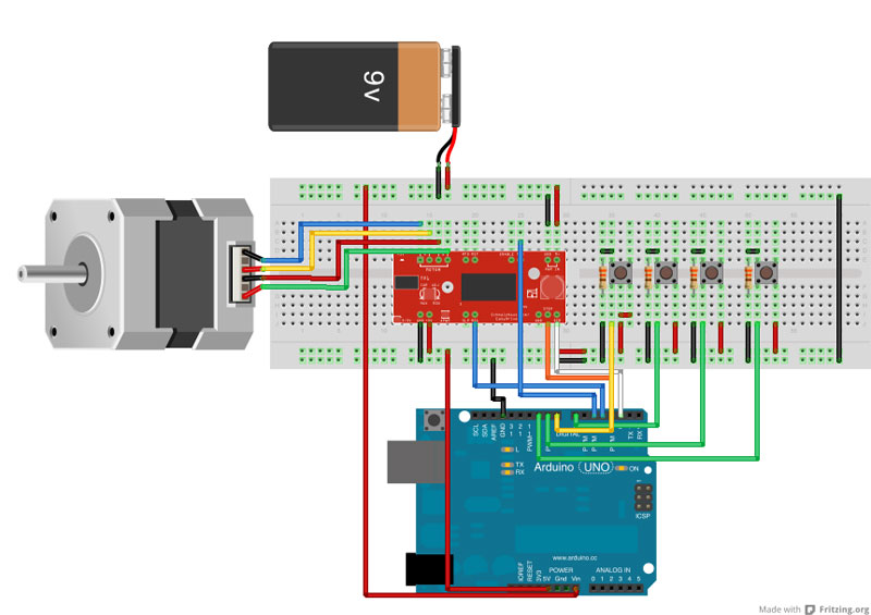avrai notato che sono presenti quattro pulsanti, il primo partendo da sinistra ( collegato ad arduino con il cavo di colore giallo ) è connesso al pin 8 e serve a far avanzare il motore di un passo alla volta; il secondo è connesso al pin 7 fa eseguire al motore 200 passi; il terzo ed il quarto sono collegati rispettivamente al pin 8 e 9 e serviranno per inviare segnali alto o basso all’easy driver sui terminali MS1 ed MS2 in funzione dei quali potrai dimezzare un passo o ridurlo di 1/4 o di 1/8.