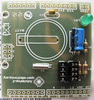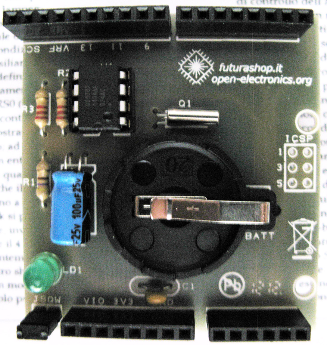 quindi prima di utilizzarla procurati un saldatore e dello stagno per assemblarla, non è difficile i componenti sono molto distanti tra loro ed il DS1307 è montato su uno zoccoletto a 8 pin che rende facile la saldatura senza compromettere l’integrato.